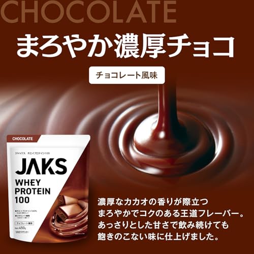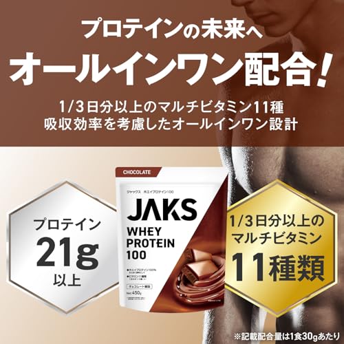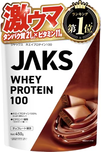 【激ウマ】 ジャックス JAKS プロテイン ホエイ 450g 国内製造 おいしい 1食分のビタミン11種類 オールインワン配合 高たんぱく質 粉末 WPCプロテイン 溶けやすい (450g, チョコレート風味)
